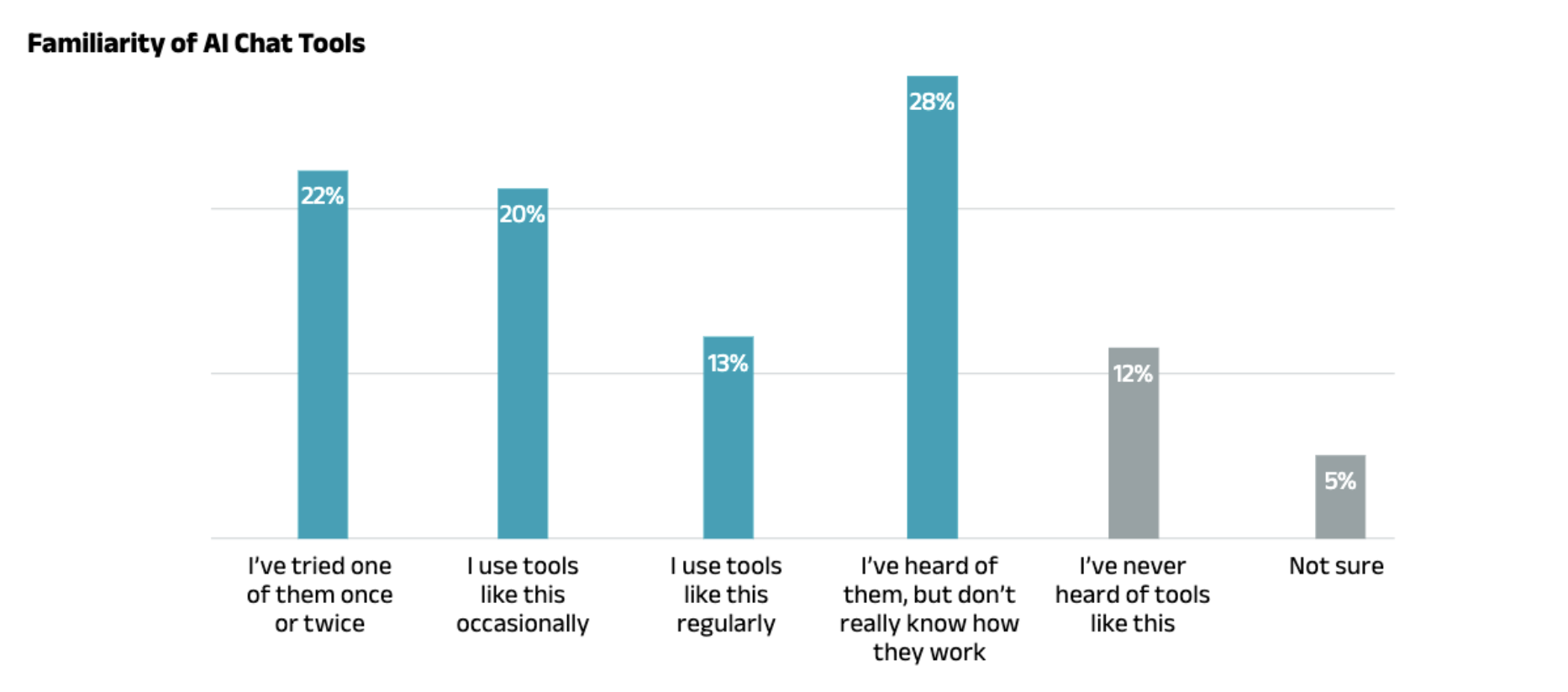AI is becoming more efficient, affordable, and accessible, lowering barriers to advanced AI and accelerating adoption. And yet, widespread consumer adoption is still in its early days. According to Lumin Digital’s consumer study, 83% of digital banking users are aware of AI tools (from any sector), but only 13% use them regularly.