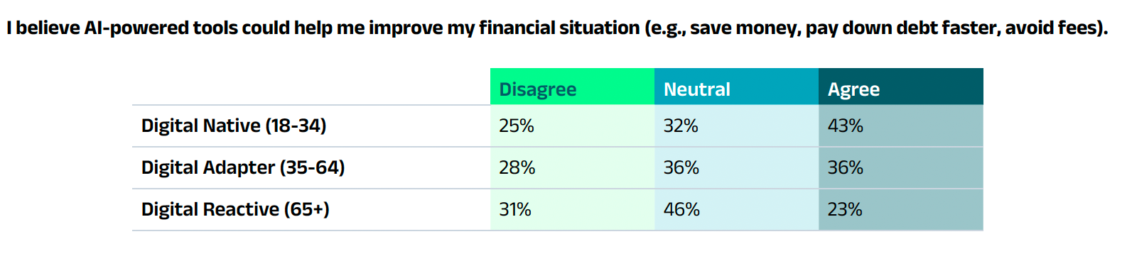 Both the youngest and middle-aged banking users appear to be ready to engage with AI, especially if it can provide useful financial information. Forty-three percent of these youngest users and 36% of the middle-aged users believe that AI has the potential to improve their financial situation.